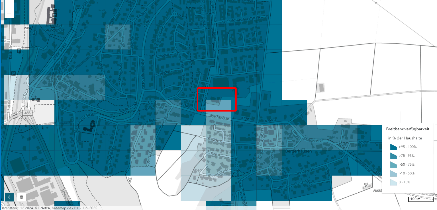 Bereits 2018 wurden im Rohbau Glasfaser-Leitungen (LWL) des Anbieters netCom BW bis in den Technikraum zu einem eigenen HÜP verlegt, aber lange nicht genutzt. Der Anschluss (Anbindung an den Hauptverteiler/Kabelverzweiger auf der Straße) scheint laut Breitbandatlas erst 23/24 wirklich realisiert worden zu sein. Ende 2024 ergab sich folgendes Bild (s.r.; Grundstück rot markiert).