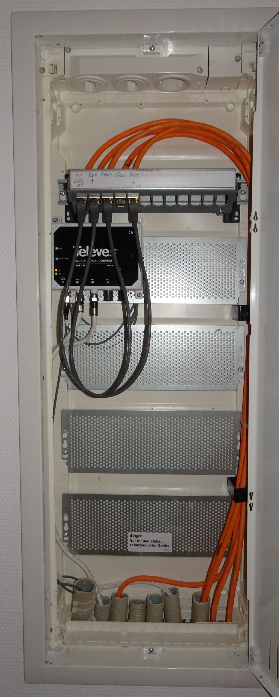 Der schwarze Kasten im Netzwerk-Verteiler ist ein weiterer Medien-Konverter, des das TV-LWL-Antennensignal vom Dach in elektrisches Koaxialkabel-Antennensignal umwandelt.