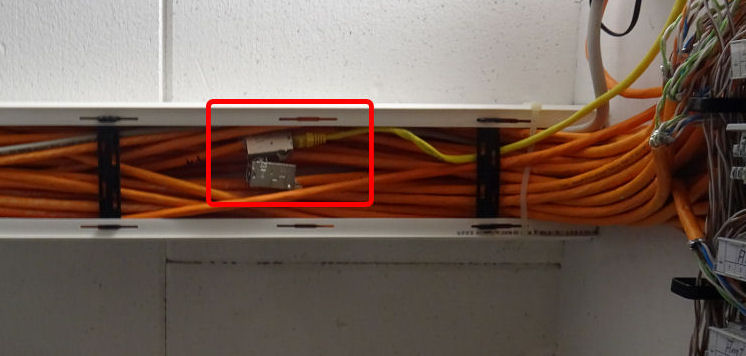 Die zu den Wohnungn führenden CAT7-Leitungen wurden im Technikraum im Kabelkanal unter der Decke aufgetrennt (s.l.) und dort jeweils mit einem gelben Patchkabel an einen Medienkonverter angeschlossen (s.r.). Die Wohnungsinhaber könnten daher theoretisch durch einfaches Umstecken zwischen alter und neuer Technik wechseln.