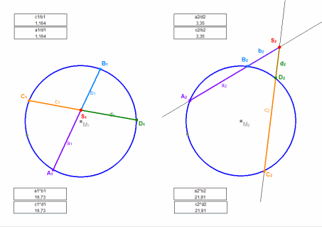 Da die DynaGeo-Dateien reine XML-(Text)Files sind, werden sie beim Aufruf von manchen Browsern nicht im Download-Ordner abgelegt, sondern direkt als Text im Tab dargestellt. Verwenden Sie dann im Kontextmenü (Rechtsklick auf ein Bild) die Option Ziel speichern unter … (Firefox) oder Link speichern unter … (MS Edge). Sehnensatz: Die Sehnen schneiden sich innerhalb des Kreises. Sekantensatz: Der Der Sekantenschnittpunkt lieg außerhalb des Kreises. Viereck ABCD ist ein Sehnenviereck (ein Viereck mit Umkreis): Im Sehnenviereck ist das Produkt der Diagonalenabschnitte konstant (und umgekehrt).