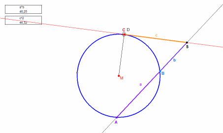 Sekanten-Tangenten-Satz: Das Quadrat des Tangentenabschnitts ist gleich dem Produkt der Sekantenabschnitte: a×b = c2 Sonderfall des Sekantensatzes; bringen Sie C und D exakt zur Deckung! Zurück |