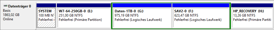 Das Bild zeigt Disk 0 des Bsp-PCs. Offensichtlich handelt es sich um einen "Bios-PC", denn nur dort sind "logische Laufwerke" i.e.S. nötig (grün gekennzeichnet). Im PC muss noch mindestens ein weiteres Laufwerks-Gerät mit einem Laufwerk C:vorhanden sein, denn im Bild fehlt Laufwerk C:.
