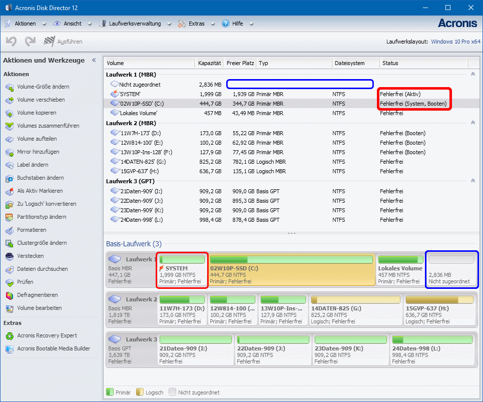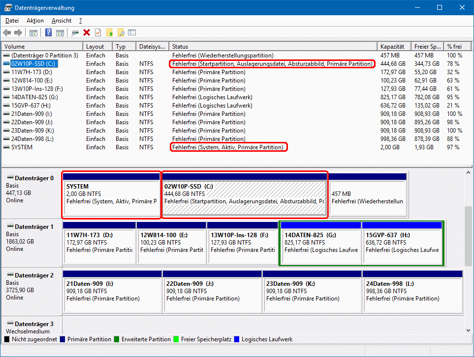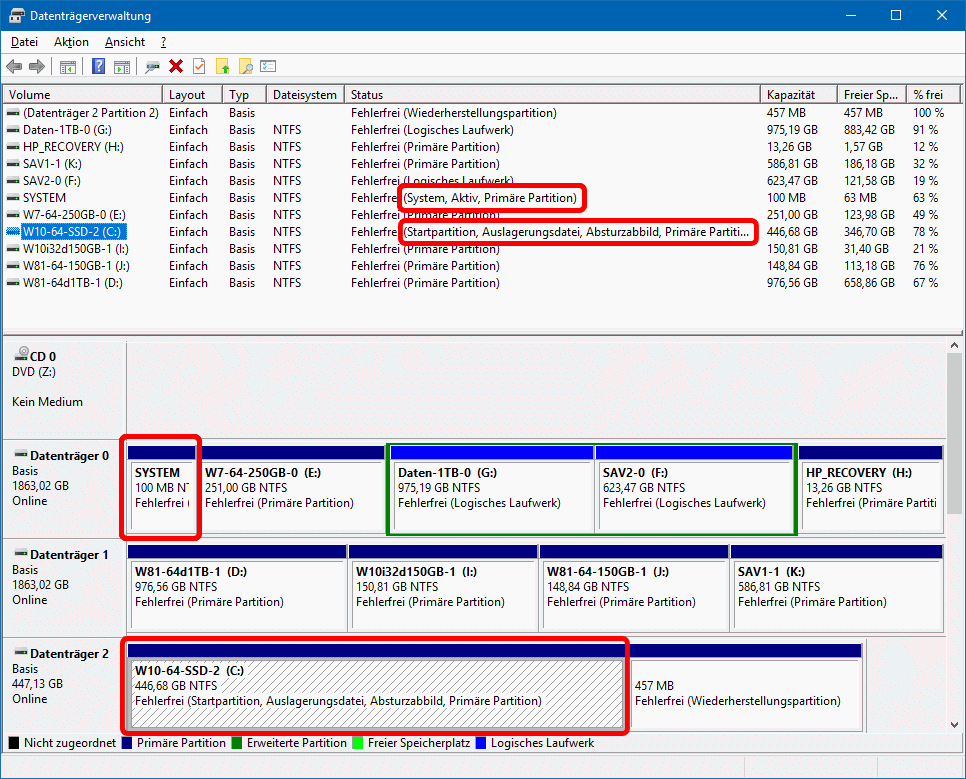 Mittels win+x > Datenträgerverwaltung wird das Programm aufgerufen. Im Bsp-PC sind zwei HDDs und eine SSD verbaut (Datenträger 0 bis 2 / disk 0 bis 2). Die Verteilung der Partitionen ist historisch gewachsen.