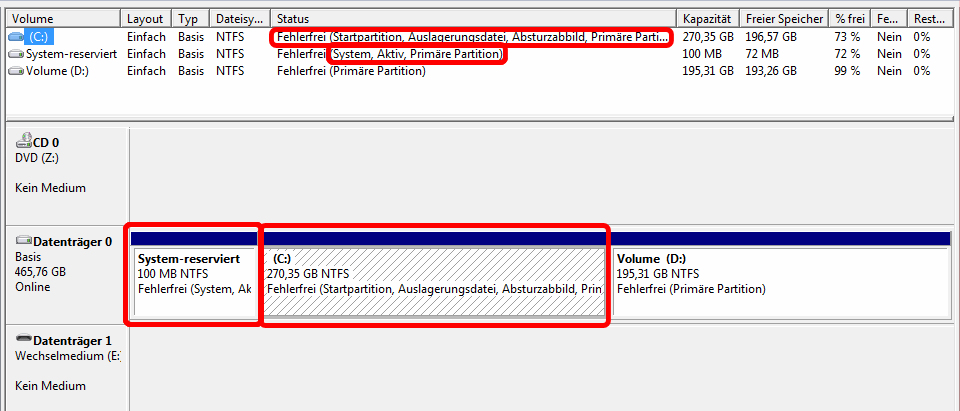 Eine "frische" HDD muss erst initialisiert werden, bevor darauf Partitionen eingerichtet werden können. Beim Initialisieren kann man zwischen MBR- und GPT-Partitionsstil wählen. Beim MBR-Stil würde die 4TB-Platte in zwei nicht zugeordnete 2TB-Bereiche eingeteilt werden, von denen nur der erste später partitionierbar wäre. Daher wurde HDD 1 im GPT-Stil initialisiert, wodurch die ganze HDD als nicht zugeordneter Bereich angeboten wurde, in dem anschließend vier 1TB-Partitionen eingerichtet werden konnten. Eingangs wurde erwähnt, dass die aktive Systempartition auch auf die schnelle SSD kommen sollte. Das macht aber relativ viel Probleme. Da zum "Umbauen" ein funktionierendes Windows praktisch war, lief der Umbau in mehreren Schritten ab, wobei u.a. die Ansteck-Reihenfolge auf dem Motherboard so geändert wurde, dass die SSD als LW 0 erscheint. Dabei wurde vor der Windowspartition auf der SSD eine Systempartition eingerichtet mit der Folge dass sich das "Haupt-Windows" nicht mehr starten ließ. Nach reger Internetrecherche musste letztlich die Registrierungsdatei System in \Windows\System32\config\ durch die Sicherung aus \Windows\System32\config\RegBack ersetzt werden. Beim Umbauen hat EasyBCD 2.3 zum Einstellen des Bootmenüs gute Dienste geleistet. Die Datenträgerverwaltung bietet nur grundlegende Dienste an. Daher wurde auch der Acronis-Diskmanager 12 eingesetzt. Die Desktop-Version beendet ggf. Windows für tiefgreifende Aufgaben und startet Windows anschließend neu. Und die Linux-Version kann man auch ohne Windows starten, um ganz von außen an den Partitionen zu "fummeln". Aber der Diskmanager 12 zeigt andere Details einer Festplatte an (s.l.o., blau umrahmt), als die Datenträgerverwaltung. Daher habe ich testhalber auch den Minitools-Partitions-Wizard 9.1 eingesetzt, der wieder andere Details anzeigt (s.r.o., blau umrahmt). Das folgende Datenträgerverwaltungsbild zeigt die Festplatte eines einfachen W7-PCs mit einer einzigen HDD. Laufwerk D: wurde dort später von Lw C: abgeteilt.