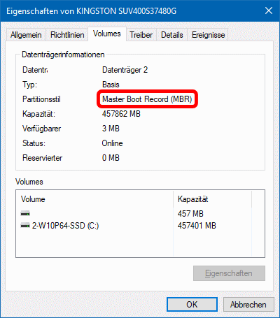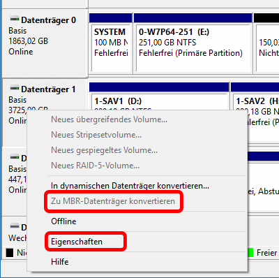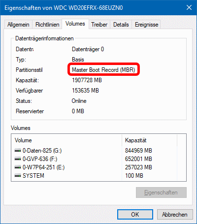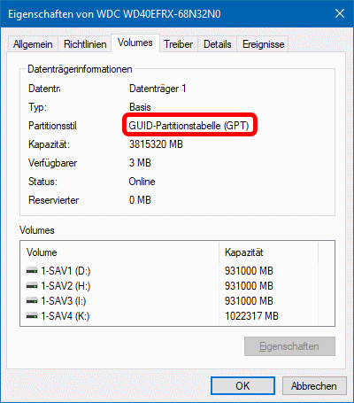 Nach dem in Abschnitt 11.4 gesagten durfte die neue "Windows-Platte" 2 TB nicht überschreiten und musste im MBR-Partitionsstil verbleiben. Dazu wurde die alte HDD geklont (soweit möglich). Die neue 4TB-Platte wurde zur reinen "Daten-Platte" im GPT-Partitionsstil (s.u.). Der Partitionierungsstil wird im Hauptfenster nicht angezeigt (s.o.). Erst nach Rechtsklick in das erste Feld Datenträger x erhalten Sie im Kontextfenster (s.l.u.) über Eigenschaften | Volumes u.a. Informationen über den eingestellten Partitionierungsstil (s.r.u. ff). Im Kontextfenster von HDD 1 sehen Sie die Option Zu MBR-Datenträger konvertieren. Die Option ist ausgegraut, da die HDD nicht leer ist; es sind bereits Partitionen eingerichtet. Die Option weist darauf hin, dass die HDD in einem anderen Partitionierungsstil initialisiert ist; da bleibt unter Windows nur GPT. Davon überzeugen Sie sich über die Option Eigenschaften.