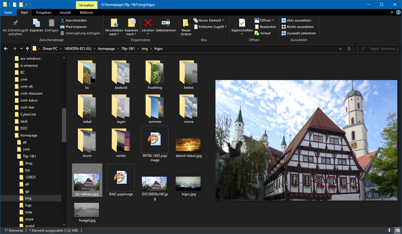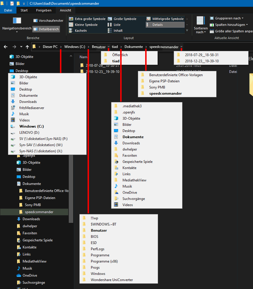 Im Bild (s.r.) ist der Brotkrumen-Pfad schön zu erkennen. In Dokumente wurde zusätzlich der Ordner speedcommander geöffnet. Wenn man zwischen die Brotkrumen auf eines der Zeichen > klickt, klappt der Ordnerinhalt des links von > stehenden Ordners nach unten auf. Im Bild ist das für alle sechs dortigen Ordner/Brotkrumen zusammenmontiert. Dietrich Tilp | 24.02.20 |