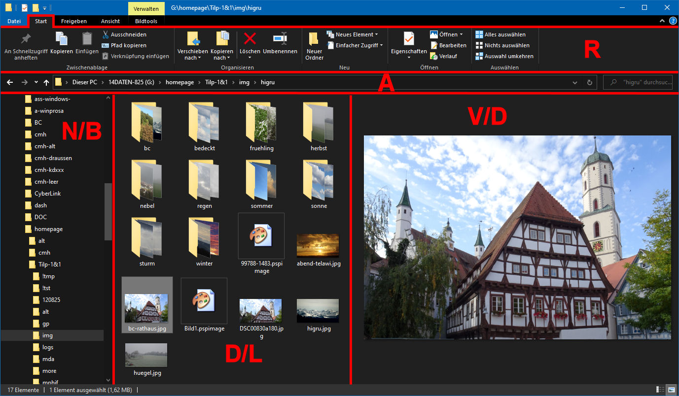 Da in W11 der Explorer "überarbeitet" wurde und dadurch anders bedient werden muss, wird auf den Text Der (Datei-)Explorer, früher Windows-Explorer genannt (im Unterschied zum Internet-Explorer) und noch früher Datei-Manager genannt, ist das Standard-Bordmittel zum Erkunden des gesamten Systems und zum Verwalten der Ordner-Struktur/Ordner-Bäume (Verzeichnis-Struktur) und Dateien. Der Explorer ist sogar das zentrale Windowsprogramm zu Darstellung aller "Oberflächen", also von Desktop, Startmenü und Taskleiste, der Anwendungsfesnter usw.; d.h. alle diese unterschiedlichen "Fenster" sind Ausdruck dieses einen Programms. Der Explorer fungiert also auch als Fenstermananger. Das Explorer-Fenster ist gegliedert in unterschiedliche Karteikarten, im Bild angezeigt ist Start (s.o.). Auf jeder Karteikarte ist oben das dynamische Menüband (R; Ribbon/Multifunktionsleiste). Darunter verläuft die Adressleiste (A). Das Hauptfeld ist gegliedert links in Navigationsbereich/Baumansicht (N/B), mittig in Dateiliste/Listenansicht (D/L) und rechts in Vorschau/Detailbereich (V/D). Wenn Sie dad Bild anklicken, wird die unbeschriftete Version eingeblendet. Außer der Adressleiste und der Dateiliste/Listenansicht lassen sich alle Teilfenster anzeigen oder verbergen. Und je nach aktiver Karteikarte zeigt das Menüband unterschiedliche Dienste/Einstellungen. Und je nach angezeigtem Dateityp werden unterschiedliche Karteikarten angeboten.