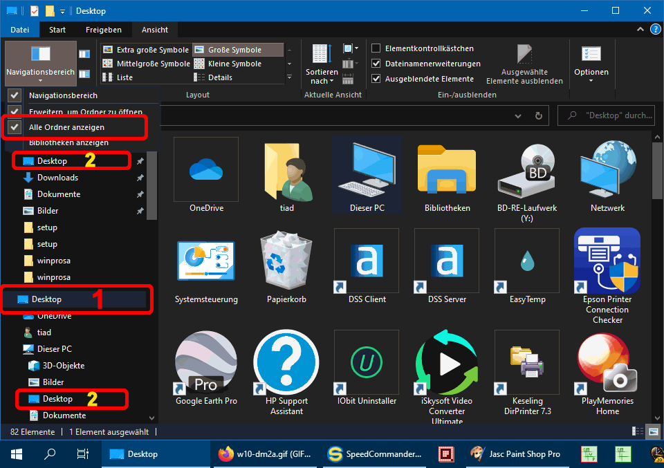 Durch die Verknüpfungslisten sind die Objekte aber nun u.U. mehrfach dargestellt, als Link und als reales Objekt. Daran gewöhnt man sich aber. Im Bild ist z.B. zweimal derselbe Benutzerordner Dokumente zu sehen (s.r.). Es gibt also mehrere Wege, um zu einem bestimmten Dokument zu gelangen. Wenn allerdings dreimal Desktop auftaucht in zweierlei Bedeutung, wird es zu viel des Guten. Das hat auch MS erkannt und diese Option abschaltbar gemacht. Im Bild (s.r.) ist diese Option Alle Ordner anzeigen in Ansicht > Navigationsbereich dummerweise noch eingestellt, daher gibt es den Desktop 1 und den Desktop 2 mit unterschiedlichem Inhalt.