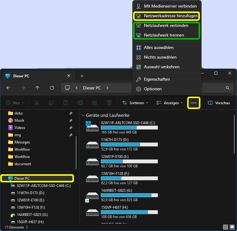 Ein grundsätzliches Problem kann beim Einrichten derartiger Speicher sein, dass die NAS-Freigaben oft andere Zugangsdaten liefern, als die Windows-Konten aufweisen: Deshalb gibt es in Windows die Anmeldeinformationsverwaltung in der (guten alten) Systemsteuerung. Dort rufen Sie die Windows-Anmeldeinformationen auf (s.u.). Sie können dann neue Anmeldeinformationen erfassen (rot markiert) oder bestehende bearbeiten (grün markiert). Im Bsp. ist DISKSTATION unter einem individuellen Benutznamen/Kennwort ansprechbar. Um auf freigegebene NAS-Daten zugreifen zu können, müssen Sie im Datei-Explorer (s.l.u.) der Reihe nach Dieser PC aktivieren, dann auf … gehen und dann entweder die Netzwerkadresse hinzufügen (alles gelb markiert) oder ein Netzlaufwerk verbinden (grün markiert). Die beiden Möglichkeiten sind im Bsp. parallel angewendet worden (s.r.u.).