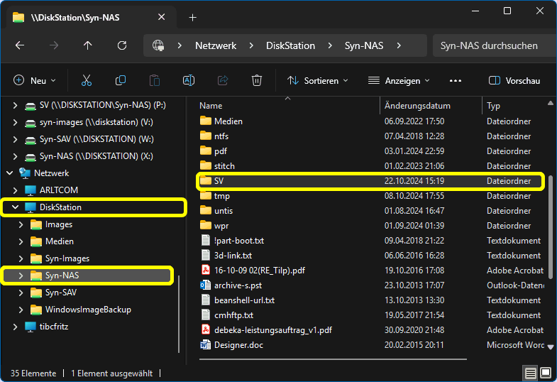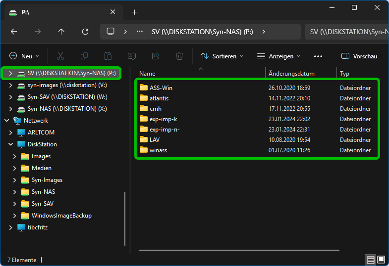 Über Netzwerkadresse hinzufügen wurde die ganze Diskstation eingebunden. Alle dort freigegebenen Ordner sind nun aufrufbar, ohne das zusätzliche Laufwerksbuchstaben belegt werden mussten (s.r.o.; gelb markiert).