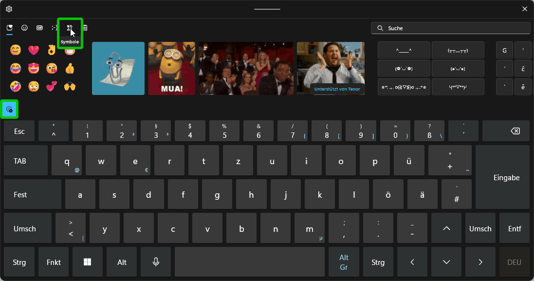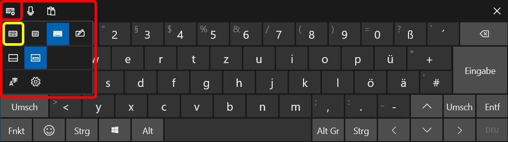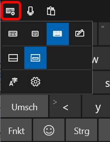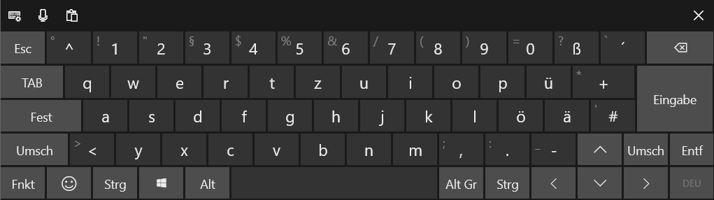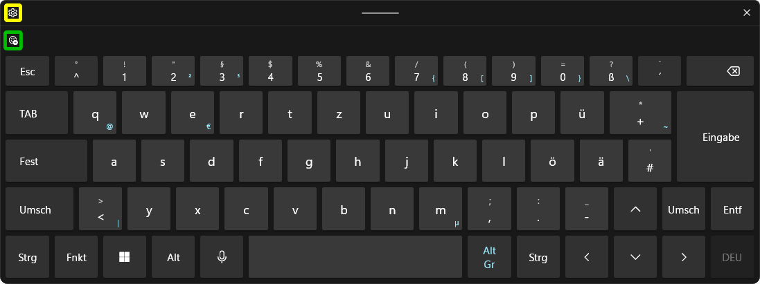 Im Folgenden wird nur Bildschirmtastatur II beschrieben, also die mit Sonderzeichen. Layout und Bedienung unterscheiden sich deutlich zwischen W10 und W11. Und wegen der fehlerhaften W11-Implementation wird zunächst nur die W10-Version behandelt mit den beiden Layouts