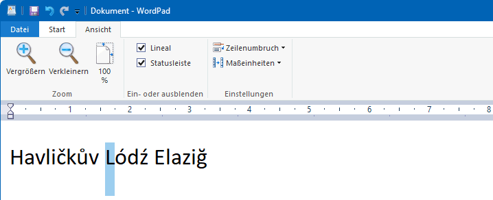 Eine 8-BIT-Anwendung kann trotz raffinierter Zeicheneingabe nur 8-Bit-Zeichen speichern, also alle Zeichen einer einzigen 8-Bit-Codepage. Das ist unabhängig davon, was auf dem Bildschirm angezeigt wird oder direkt auf dem Drucker ausgegeben wird! Spätestens nach dem Abspeichern und anschließendem erneuten Laden des fraglichen Textes zeigt sich der Erfolg/Misserfolg. In Windows sind standardmäßig der Editor Notepad und die Minitextverarbeitung WordPad vorhanden. MS-Office/Word muss hinzugekauft werden. Alle drei können im Prinzip 16-Bit-Zeichen verarbeiten. Anhand dieser drei Programme werden die Grenzen der Sonderbuchstabenverarbeitung anhand eines kleinen Mustertextes erörtert: Adélaïde Françoise Dufrénoy war in Havlíčkův Brod und in Łódź.