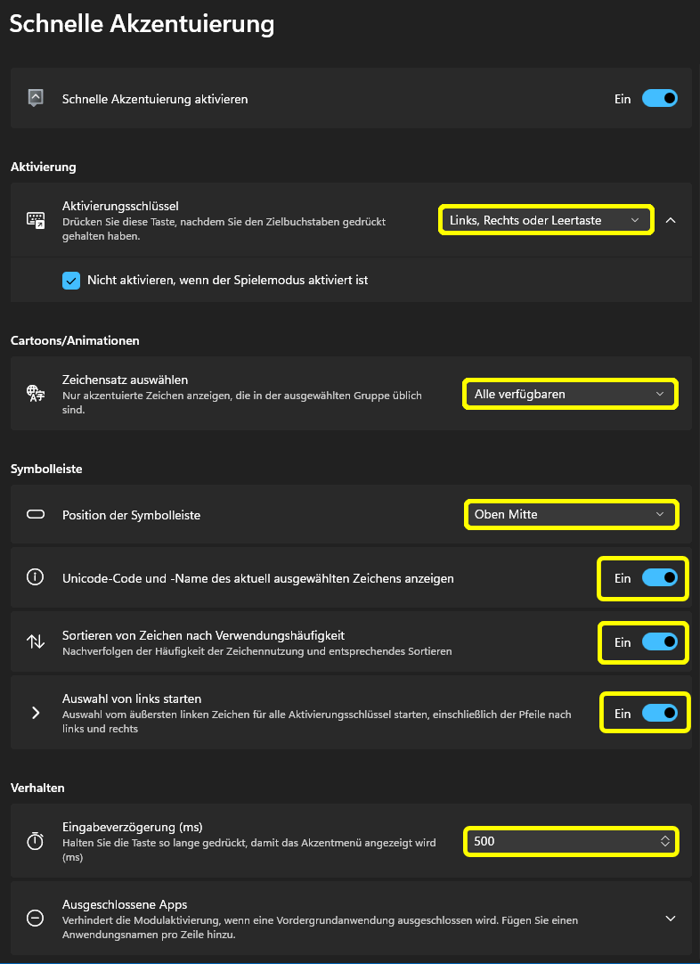 Das klappt also gegenüber W10 immer noch stümperhaft, aber es klappt (Stand Februar 26; W11 gibt's schon seit Juni 21). d) Schnelle Akzentuierung mit PowerToys Das Tool Schnelle Akzentuierung (Quick Accent) kann in W11 als Ersatz für die vermurkste Bildschirmtastatur II verwendet werden.