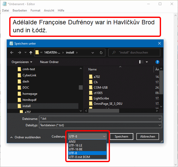 Aber Notepad kennt dreistellige Alt-Nummern und kann 16-Bit-Unicodezeichen z.B. über die Bildschirmtastatur aufnehmen. Und beim Speichern kann man die Codierung wählen. Allerdings sind die Auswahlen sehr technisch formuliert: entweder die 8-Bit-Zeichencodetabelle ANSI oder eines der Unicode-Abbildungformate UTF. Und jede Datei wird als txt-Datei abgelegt, also mit der Dateinamenserweiterung .txt .