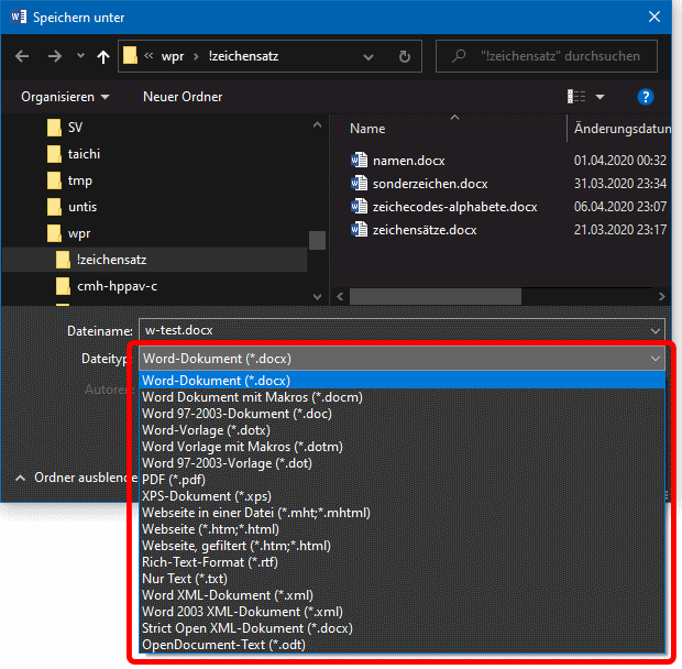 Dokumente lassen sich auch im alten .doc-Format speichern, das im Prizip ein unkomprimiertes und verschlüsseltes .rtf-Format ist. .doc-Dateien können Makros beinhalten und sind daher per se gefährlich, sollten also nicht mehr verwendet werden. .doc-Dateien sind typischerweise über doppelt so groß wie ihre .docx-Pendants. Neben den vielen weiteren zu Office gehörigen Formaten ist natürlich auch .rtf möglich, aber da Word viel mehr Formatierungsmöglichkeiten kennt, sind dessen .rtf-Dateien prinzipiell viel größer als deren WordPad-Pendants.