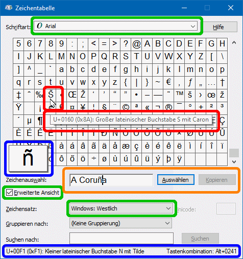 Wenn Sie in der Tabelle einen Buchstaben anklicken, wird der vergrößert angezeigt und unten wird sein Unicode-Codepoint in hexadezimaler vierstelliger Unicode-Notierung (16 Bit) angezeigt, dann in Klammern sein aktueller Windowszeichensatz-Codepoint in normaler hexadezimaler zweistelliger Darstellung (8 Bit), dann die Buchstabenbeschreibung und ggf. ganz rechts der für Word gültige Tastaturcode ("Alt-Nummer") (blau markiert). Siehe Sie können als Zeichensatz natürlich auch Unicode einstellen, dann wird die Tabelle aber unübersichtlich, weil dann z.B. ca 3200 Glyphen der Schriftart Arial in der durch deren Codepoints vorgegebenen Reihenfolge eingeblendet werden. Unabhängig davon, ob ein Zeichen in der Tabelle bereits aktiviert ist, können sie mit der Maus über die Tabelle fahren und erhalten zum aktuellen Zeichgen die Codeinformationen und die Zeichenbeschreibung (rot markiert). Im Beispiel ist sehr schön der Unterschied zwischen dem 8-Bit-Windows-Codepoint und dem 16-Bit-Unicode-Codepoint zu sehen: Unicode-Codepoint U+0160 (= 352 dez.), Windows-Codepoint 0x8A (= 130 dez.). Im Feld Zeichenauswahl (orange markiert) können Sie normalen Text über die Tastatur erfassen oder per Copy and paste eintragen. Wenn Sie dann den Cursor im Text positionieren und mit der Maus ein Zeichen in der Tabelle aktivieren, wird das mittels Auswählen an der Cursorposition eingefügt. Ist der Text komplettiert, wird er mittels Kopieren zur Weiterverwendung in die Zwischenablage übertragen. Das Charmap-Fenster ist in der Größe nicht variierbar, es zeigt immer 10 Zeilen à 20 Glyphen. Wenn man die Tabellen insgesamt untersucht, ist zu erkennen, wie einerseits im 8-Bit-Schema teils logische Abfolgen verwendet worden waren, teils reine Lückenfüllerei betrieben worden war. Z.B. das rot markierte Zeichen Š hat, wie seine Nachbarzeichen Œ und Ž, keinen Bezug zum ansonsten geordneten Alphabet.