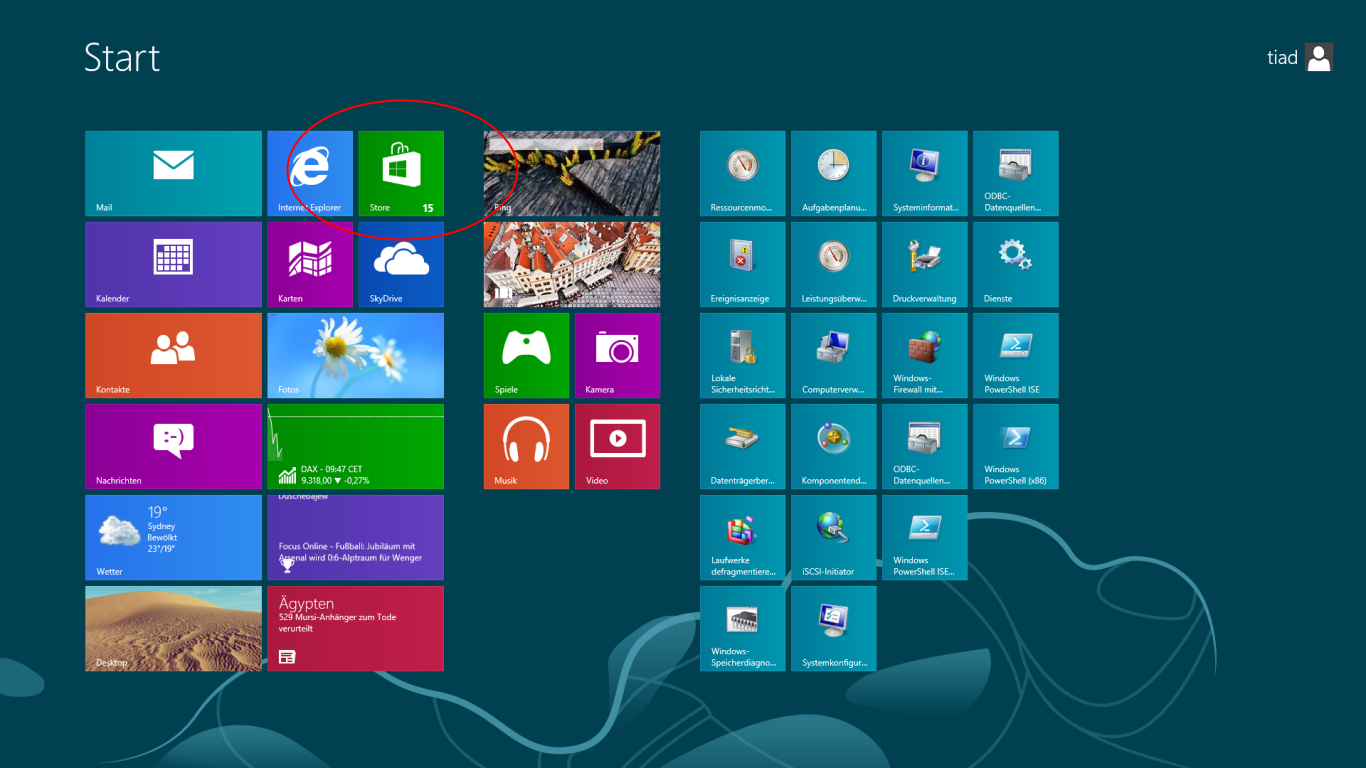 Mouser: Falls der Desktop angezeigt wird, müssen Sie zur Startseite wechseln, denn der Windows-Store ist eine Kachel-App, also (noch) nur bei den Kacheln zu finden. Durch Klick in die linke untere Ecke oder mittels Windows-Taste (
