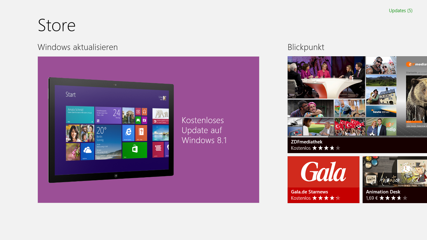Starten Sie also den Windows Store. Gleich auf der ersten Seite werden Sie aufgefordert, den Update-Vorgang auszulösen (s.l.). Wählen Sie Windows aktualisieren.