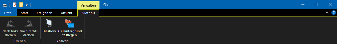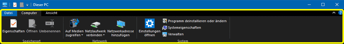 Die Menübandtechnik war ursprünglich für MS Office 2007 entwickelt worden und wurde von mehreren Softwareschmieden übernommen. Bei Bedarf kann das Menüband eingeklappt werden (s.r.o.; gelb markiert). In ausgeklapptem Zustand ist es beim Explorer in mehrere Register gegliedert, jedes Register stellt ein eigenständiges Menüband dar. So können insgesamt sehr viele Untermenüs und Befehle aufgenohmen werden. Die Struktur der Registerkarten ist kontextbezogen. Bei Dieser PC werden Computer und Ansicht angeboten (s.r.o.), ansonsten meist Start, Freigeben und Ansicht, manchmal auch zusätzliche Verwaltungstools wie Laufwerktools und Bildtools (s.r.). Bei dieser aufgabenbezogenen Registerstruktur bleibt nicht aus, dass manche Dienste sich in mehreren Registerkarten wiederholen. Aber weil genügender Platz vorhanden ist, werden meist Icons verwendet und Aktivieren/Deaktivieren wird ggf. durch Ausgrauen gekennzeichnet.