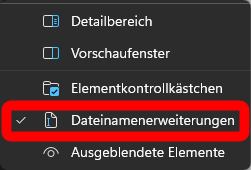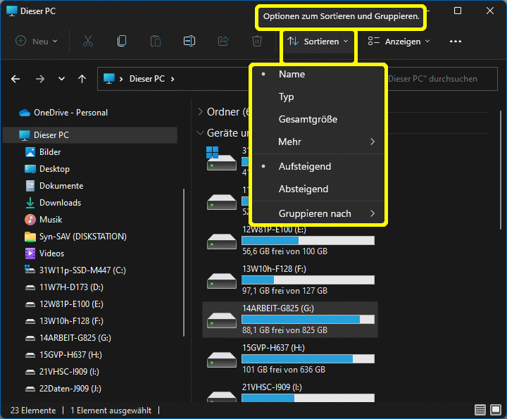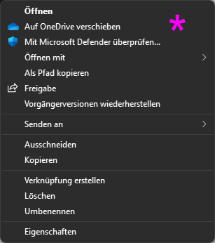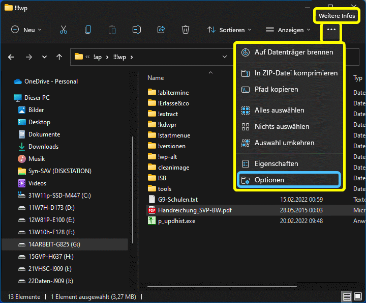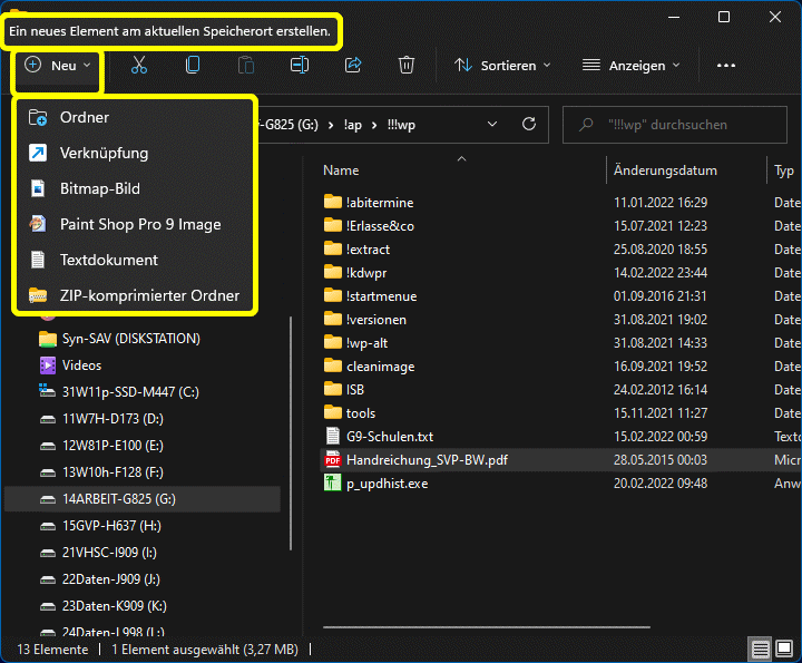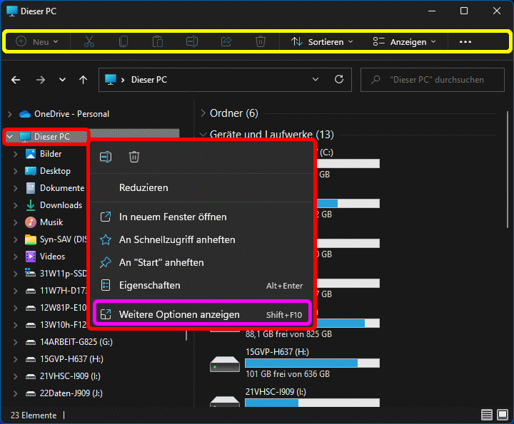 *) W11 Im Explorer von W11 gibt es anstelle des Menübandes nur noch eine Menüzeile (s.l.u.; gelb markiert). Zu jedem Eintrag in der Explorerliste kann ein gekürztes Kontextmenü aufgerufen werden (rot markiert). Diese Kontextmenüs weisen immer als letzten Eintrag auf Weitere Optionen anzeigen (pinkfarben markiert). Weil diese schlichte Einzeiler-Menüzeile natürlich nicht ausreicht, sind einige Aktionen in vier Untermenüs Neu, Sortieren, Anzeigen und … ausgelagert (s.u.; gelb markiert).