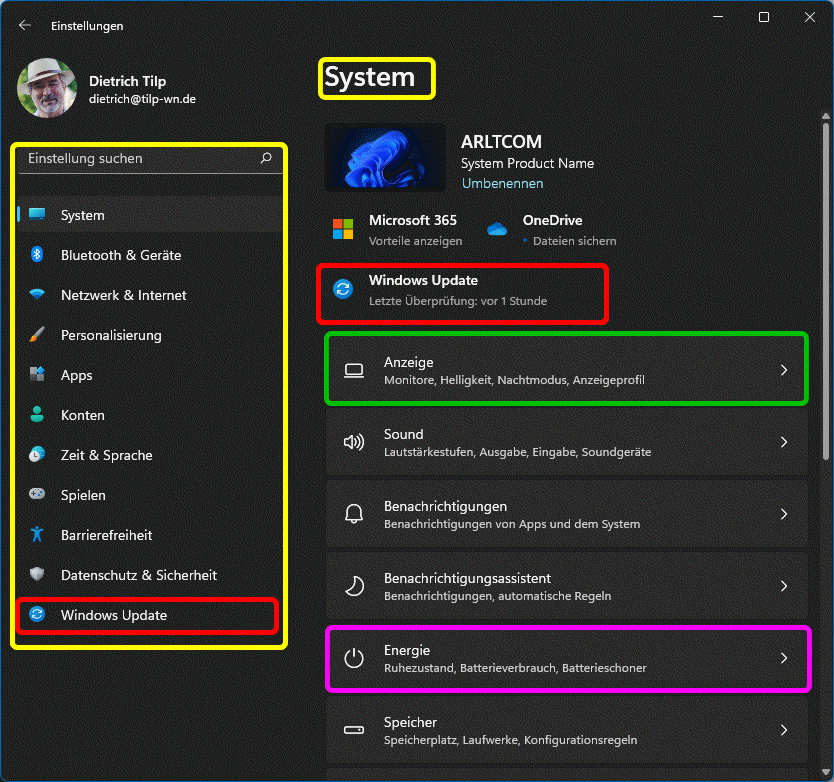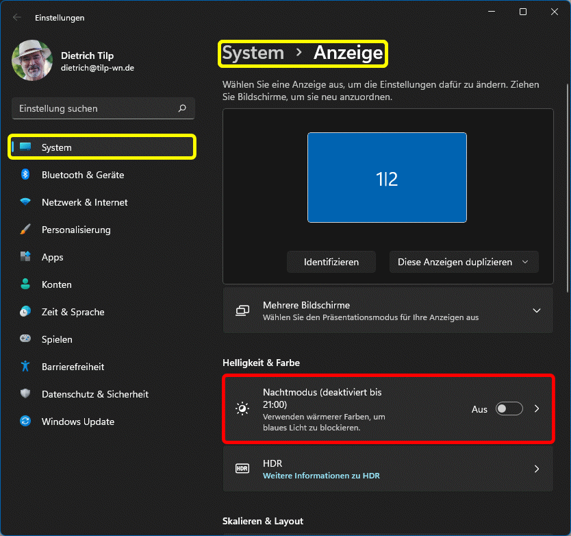 Kontextmenüs öffnen sich bekanntlich nach Rechtsklick auf das entsprechenden Objekt, in dem Fall also eine leere Stelle des Desktops. Überstreicht man die mit > gekennzeichneten Menüpunkte, läuft rechts daneben das jeweilige Untermenü mit (rot markiert). Die jeweiligen Menüeinträge sind selbsterklärend. Wie an vielen anderen Stellen in der Einstellungsapp sind Kontext- oder Untermenüs stark gekürzt, weisen daher "Folgemenüpunkte" auf (pinkfarben markiert). Im vorliegenden Fall sind die aber ein Witz; das Folgemenü entspricht fast genau dem ursprünglichen Kontextmenü. Solche Fehlstellen zeigen, dass W11 noch viel Feinschliff braucht! Anpassen Ein Klick auf Anpassen startet den Einstellungsdienst Personalisierung. Das Fenster der W11-App Einstellungen ist immer zweigeteilt. Links sind dauerhaft alle Rubriken aufgeführt. Rechts sind zunächst alle Unterrubriken der aktuellen Rubrik aufgelistet. Nach Aktivierung einer dieser Unterrubriken, nimmt die den ganzen rechten Raum ein und bietet alle Einstellungspunkte (Unter-Unterrubriken) an. Die meisten Rubriken bieten viele Unterrubriken, die durch senkrechtes Scollen errreichbar sind (s.u.). Nach Aktivierung z.B. von Farben ist zu erkennen, wie die Titelzeile der rechten Seite als Brotkrumen-Pfad gestaltet ist (s.u.; gelb markiert). Brotkrumen-Pfade werden schon seit langem z.B. auch beim Dateiexplorer in der Adresszeile vorgegeben. Jede einzelne Brotkrume kann aktiviert werden, um in der Spur vorwärts oder rückwärts zu wandern. Wichtig ist hier vor allem die rot markierte Einstellung (s.r.o.). Ihr Wert ist erst zu erkennen, wenn sich auf dem Desktop mehrere (Programm-)Fenster tummeln. Anzeigeeinstellungen Nach Aufruf der Anzeigeeinstellungen gelangt man in der Einstellungs-App direkt in die Rubrik System > Anzeige. Interessant ist hier zunächst der Nachtmodus (s.l.o.) und die Skalierung und Bildschirmauflösung (s.r.o.). Skalierung und Auflösung stellt Windows normalerweise optimal ein; wenn aber der Monitor nicht richtig erkannt wird, dann kann hier nachjustiert werden. Die Einstellungen-APP Die Einstellungen-App wird über das (primäre) Startmenü oder das sekundäre Startmenü aufgerufen. Wie bereits erwähnt, werden links immer alle Rubriken eingeblendet. Nach direktem Aufruf ist immer die erste Rubrik System aktiv. Rechts sind also die Unterrubriken von System aufgelistet.