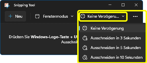 Dort kann ein Screenshot aufgenommen werden über + Neu (gelb markiert) oder über die vorgegebene Tastenkombination win + Shift + s (rot markiert).
