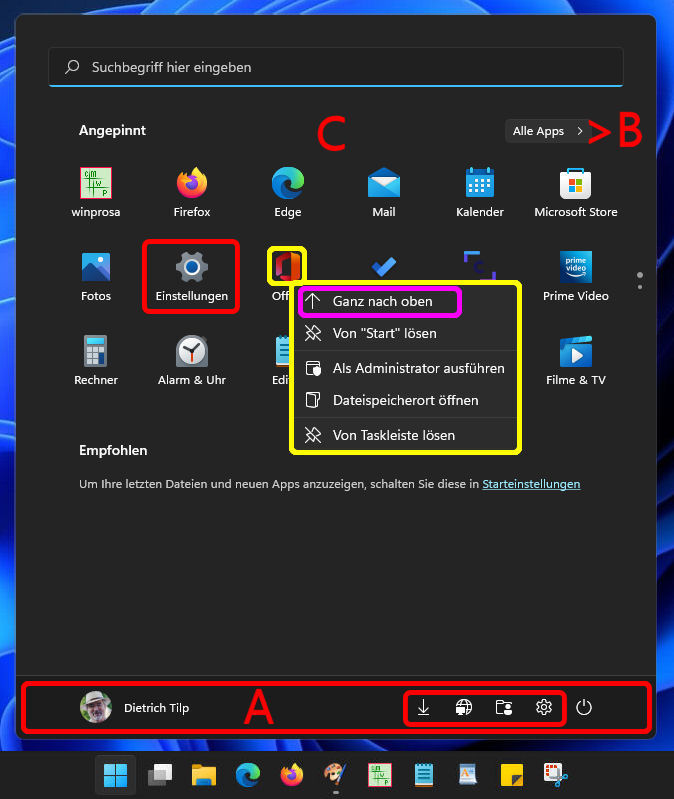 Über Einstellungen > Personalisierung > Start > Ordner können Sie das Menü A füllen (rot markiert). So erhält