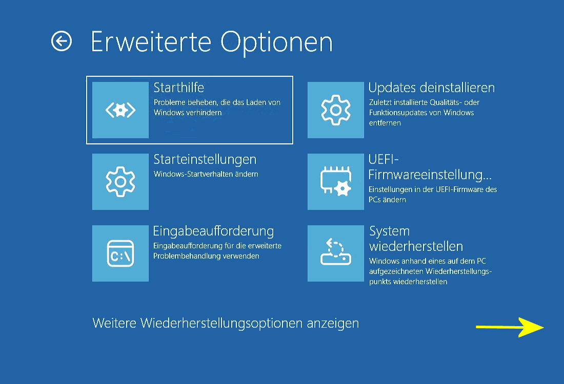 Tipps aus dem Netz Zur Reparatur gehören neben div. internen und externen Reparatur-Tools auch Neuinstallationen und Reparaturinstallationen mit Datenerhalt. Und hierzu gehören auch Tipps und Tricks zum Wechsel von W10 zu W11, auch für "ungeeignete" PCs. Ablaufdatum im UEFI-Bios: praktisch alle PCs betroffen - Secure Boot Zertifikate laufen ab (05.07.2025 | 13:16) Ist euer neuer Windows 11 PC bald schon nicht mehr Windows 11 25H2 kompatibel? (04.06.2025 | 14:25) Windows 11 24H2 verschlüsselt heimlich den PC - Geräteverschlüsselung deaktivieren (08.03.2025 | 10:48) Der Windows 11 Dirty Bit Bug - Bei diesem Laufwerk liegt ein Problem vor - reparieren und überprüfen (21.01.2025 | 14:32) Festplatte wird nicht erkannt - Windows 11 Linux Daten retten wiederherstellen - SSD und M2 (04.01.2025 | 17:40) Diese 10 wichtigen Elektronik Tools benutze ich immer (12.11.2024 | 16:23) Microsoft stoppt Windows 11 24H2 für bestimmte PCs - Immer mehr Probleme mit SSDs und Treibern (22.10.2024 | 16:03) Dieser PC ist ein Opfer der Kondensatorpest (06.09.2024 | 11:42) Windows Spionage Stopp in 1 Minute - Microsoft darf nicht mehr nach Hause telefonieren (25.06.2024 | 13:45) PC lässt sich gar nicht mehr einschalten - ein Bios-Problem - einfach repariert ( 04.05.2024 | 13:16) Überraschende Methode den PC schneller und stabiler zu machen - Schnellstart deaktivieren (01.08.2023 | 16:28) Windows 11 startet nicht - Windows reparieren - schwarzer Bildschirm - Automatische Reparatur (22.02.2022 | 21:58) Windows 10 startet nicht - BOOTMGR fehlt - Bootcode Bootsektor reparieren (21.11.2019 | 18:18) Anleitung: Windows reparieren ohne Datenverlust (05.02.2023 | 10:13) *** Windows11 neu installieren ohne Datenverlust (15.06.2025 | 10:08) *** Windows 11 neu installieren: Die besten Tricks, die ihr kennen müsst (01.09.2024 | 12:13) 1-Klick-Upgrade: Windows 10 auf 11 Upgrade für inkompatible Geräte (30.01.2025 | 12:13) SFC + DISM: So reparierst du Windows ohne Datenverlust – funktioniert wirklich! (27.06.2025 | 19:56) *** Patchday Juli 2025: Diese Windows-Updates MUSST du jetzt installieren! (09.07.2025 | 12:59) *** Copilot, Recall & Bugfixes: Was die neuen Windows-Updates wirklich bringen! (24.07.2025 | 24:26) Windows 10/11: Diese versteckten Funktionen könnten deinen PC retten! (23.07.2025 | 15:46) 100+ Windows-Tweaks für ein sauberes System (09.08.2025 | 16:35) Warum Windows bei 46% hängen bleibt – Die 5 Setup-Phasen einfach erklärt (06.12.2025 | 3:56) PC kann nicht zurückgesetzt werden und eine erforderliche Laufwerkspartition fehlt ( 20.10.2022 | 6:10) Aufruf der Reparatur-Optionen Nachdem der Bootvorgang dreimal hintereinander abgebrochen wurde, wird die automatische Reparatur eingeleitet. Wenn dabei nach der Diagnose des Systems der Reparaturversuch misslingt, wird der Aufruf der Erweiterten Optionen angeboten (s.u.). Das zugehorige Fenster Optionen auswählen (s.r.u.) ist das zentrale Reparaturfenster. Diese Optionen können im Bootmenü auch unten händisch aufgerufen werden (s.l.u.). Und wenn der PC beim Starten kein Bootmenü zeigt, kommen Sie z.B. über shift + Neu starten direkt zum Fenster Optionen auswählen (s.r.u.).