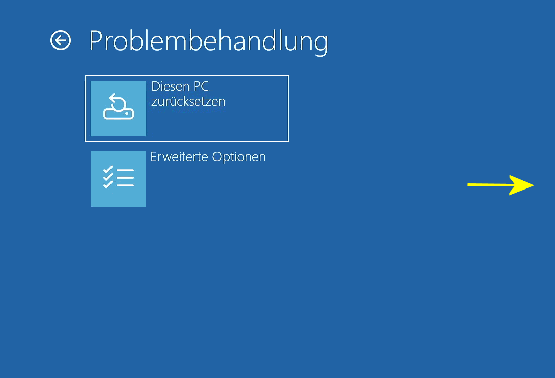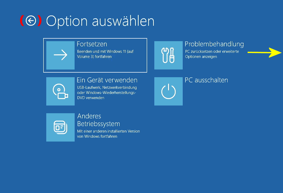 Sie können unter fünf (weiteren) Optionen auswählen (s.r.u.): Die Problembehandlung (s.o.) bietet das Zurücksetzen des PCs/Betriebssystems (s.l.u.) und Erweiterte Optionen.
