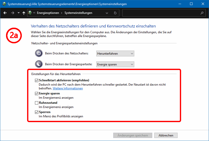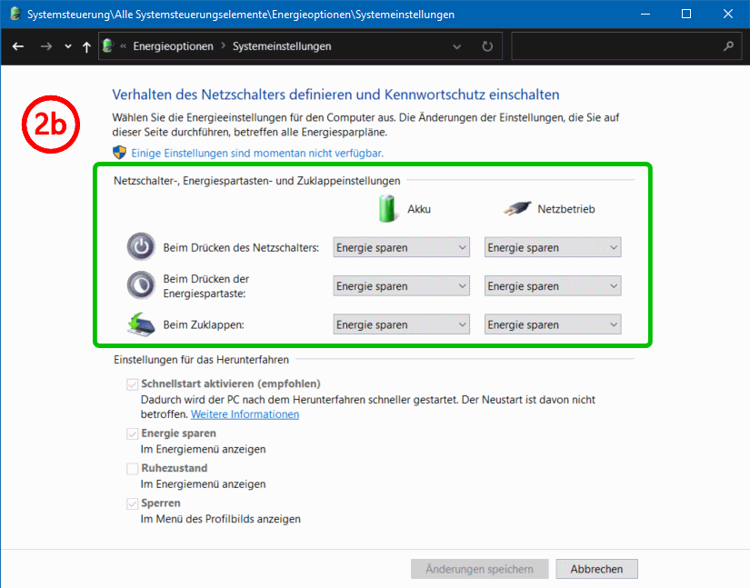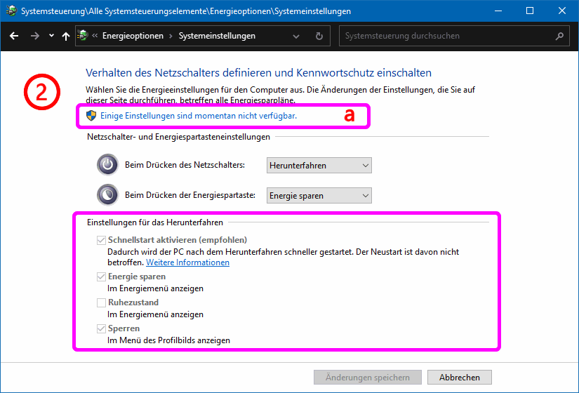 Dort wählen Sie im Hauptteil (= "Energiesparplan erstellen") zwischen Über den Punkt 3 können Sie das Fenster Energieoptionen > Energiesparplan erstellen aufrufen (s.w.u.). Das brauchen Sie aber nur, wenn Sie zu den vorhandenen Energieoptionen weitere definieren wollen. Über den Punkt 2 öffnen Sie das Fenster Energieoptionen > Systemeinstellungen. Dort sind die Einstellungen für das Herunterfahren zunächst ausgegraut (s.l.u.); über den nur durch Admins aufrufbaren Punkt Einige Einstellungen sind momentan nicht verfügbar (s.l.u., mit a markiert) werden diese Optionen freigeschaltet (s.r.u.).