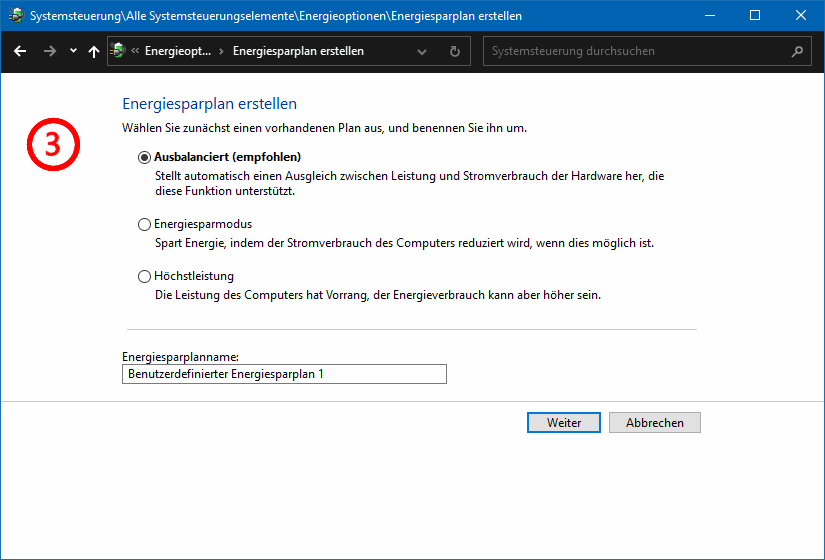 Das Fenster Energiesparplan erstellen werden Sie, wie bereits erwähnt, eher nicht benötigen (s.l.u., 3).