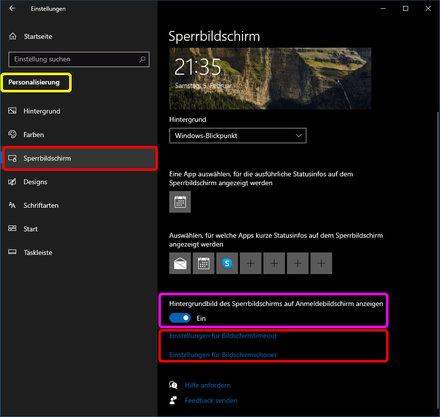 Weil man die Personalisierung aber (vor allem in der Anfangszeit) oft braucht, kann sie auch direkt über den Punkt Anpassen im Kontxtmenü des Desktops aufgerufen werden. In der Rubrik Sperrbildschirm können Sie im oberen Teil das Aussehen des Sperrbildschirms konfigurieren. Und Sie können dafür sorgen, dass dessen Hintergrundbild den drögen Anmeldebildschirm auffrischt (pinkfarben markiert). Die Pausierungsoptionen bearbeiten Sie in den Einstellungen für Bildschirmtimeout und den Einstellungen für Bildschirmschoner (beide rot markiert).