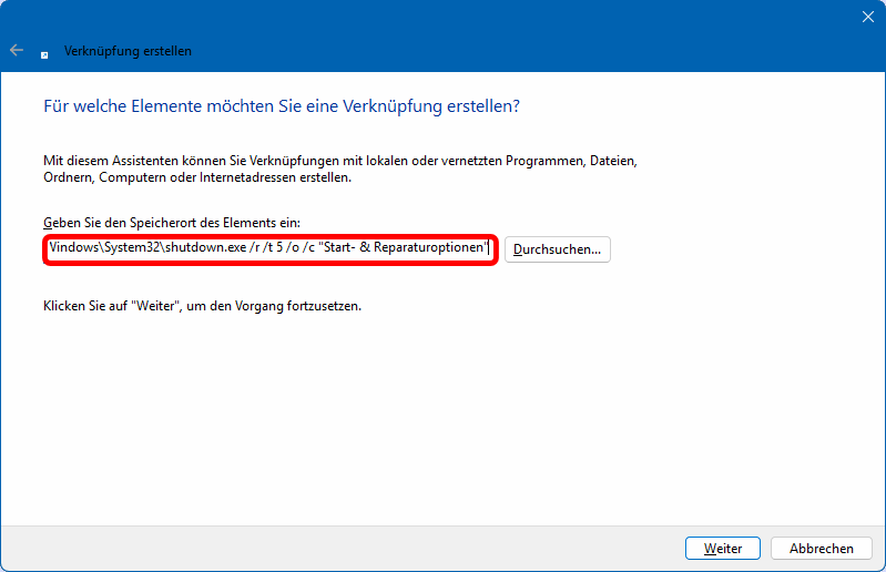 Start-Optionen Zur Erstellung einer derartigen Verknüpfung (Bsp.: Start-Optionen) rufen Sie im Kontextmenü des Desktops auf Neu > Verknüpfung und geben im ersten Fenster den roten Text ein (s.l.u.) und nach Weiter im nächsten den grünen Text (s.r.u.). Nach Fertig stellen der Verknüpfung rufen Sie über deren Kontextmenü die Eigenschaften auf (s.l.o.) und suchen über Anderes Symbol … ein geeignetes Icon aus (blau markiert). Die anderen Verknüpfungen erstellen Sie am schnellsten mittels Copy und Paste aus der eben erstellten: Erstellen Sie eine Kopie und benennen die um in z.B BIOS-Start, öffnen Sie dann die Eigenschaften der neuen Verknüpfung und ändern die Parameter z.B. in /r /fw /t 5 /c "zum UEFI/BIOS". Wählen Sie ein Anders Symbol.