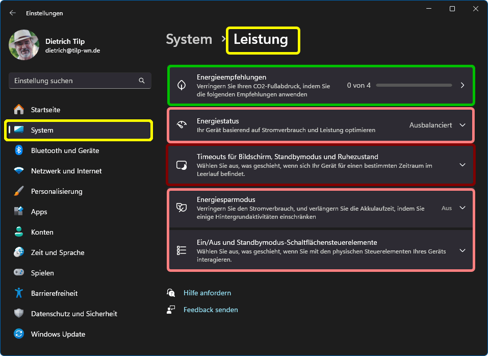 Und durch Anhaken von In W11 rufen Sie die Energiesparoptionen über Einstellungen > System > Leistung auf (s.u.). Dort sind auch die TimeOut-Einstellungen zu finden (braun markiert). Aber alle Einstellungen folgen der MS-Logik Simple Speech. Also werden die Begriffe Standbymodus, Ruhezustand, usw. nicht erklärt, was an den aufgeklappten Menüs gut zu erkennen ist (s.r.). Und wenn man dort den verwandten Link Energiesparmoduseinstellungen werden ausgewählt, landet man nicht bei den Systemeinstellungen, sondern bei MS im Netz, wo dann ein nicht existierender Programmpfad angeboten wird (W11 24H2, Nov.24). Dafür gibt es nun Energieempfehlungen (grün markiert).