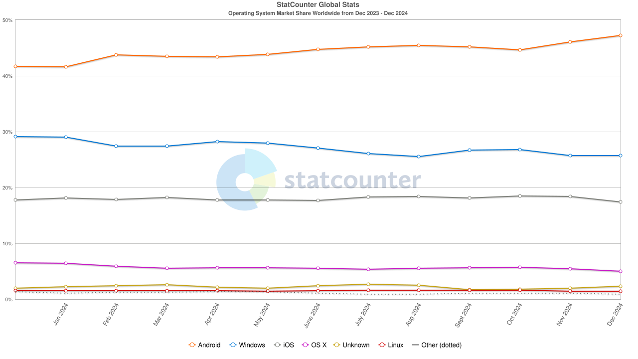 Ende 2024 teilte sich laut Statcounter global stats der Betriebssystemmarkt auf in Android 47,21%, Windows 25,37%, IOS 17,40% und Linux 1,46% (s.l.u.).