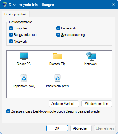 Über Einstellungen > Personalisierung > Designs ist in der Abteilung Verwandte Einstellungen > Desktopsymboleinstellungen der entsprechende Dienst aufrufbar (s.r.). Besonders interessant ist dabei der Aufruf der Systemsteuerung (aus W7-Zeiten), weil dort Einstellungsaufrufe kompakt gesammelt sind, die in W11 verstreut sind oder dort noch fehlen.