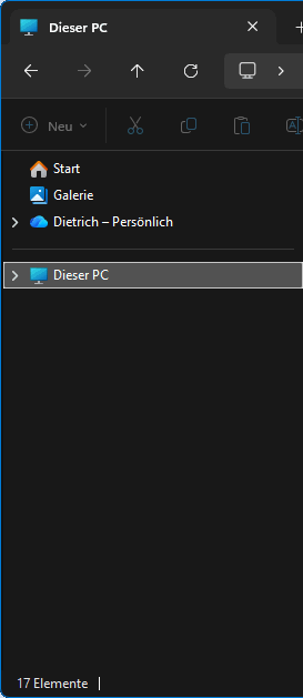 Viel entscheidender ist aber, was ein (einziger) Ordner Bilder (oder Dokumente, Videos, Musik usw.) überhaupt soll; "Images" kann/darf man schließlich (fast) überall speichern, nicht nur im einen Ordner Bilder. Und auch der Begriff "Schnellzugriff" ist mehrdeutig: Schnellzugriff auf Programme und Daten oder Schnellzugriff auf Systemeinstellungen und Anpassungen. Die "Anzeigevielfalt" (l.a.) gibt es mindestens seit W7 und seit damals habe ich mich dieser Technik verweigert, u.a., weil mich drei "verschiedene" Desktops verschreckt hatten. Mir hatte lange Zeit die Arbeit mit Startmenü und Taskleiste vollkommen genügt, so dass mir eine Minimalkonfiguration (s.r.) vollauf ausreichte. Und für meine Dateiverwaltung verwende ich i.d.R. das Fremdprodukt SpeedCommander. Aber der Explorer ist ein sehr mächtiges Werkzeug, das ich mittlerweile für Sonderarbeiten vermehrt einsetzte. • Explorer-Grundeinstellung Es gibt also viel zu erörtern und zu systematisieren. Doch vorab soll der Navigationsbereich im Explorer übersichtlich konfiguriert werden: