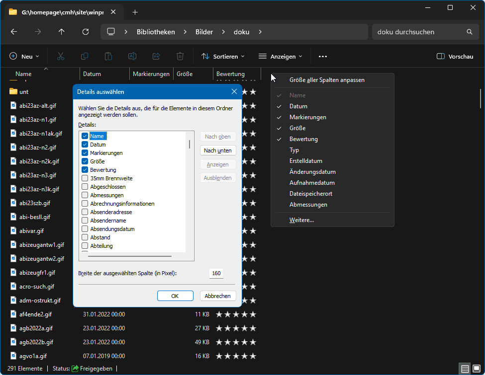 Über den Schalter Anzeigen stellen Sie die Layout- und Ansichtsoptionen ein (s.l.u.; gelb markiert). Gerade sind Details gewählt. In der Option Einblenden (pinkfarben markiert) sind i.d.R. die Einstellungen Navigationsbereich, Kompakte Ansicht und Dateinamenserweiterungen anzeigen angehakt. In Listendarstellungen mit Tabellenkopf können Sie durch Rechtsklick in den Tabellenkopf weitere Spalten anzeigen lassen (s.r.o.) und dort über weitere das Fenster Details auswählen aufrufen, um zusätzliche einzublendende Spalten zu bestimmen. Die dort angebotene Liste ist sehr lang! ∘ Schnellwechsel der Ansicht
