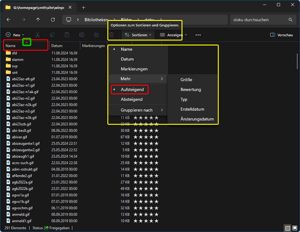 Tipp: Auf- oder Absteigend einfacher/schneller per Klick im Tabellenkopf einstellen und das alternativ für jede Spalte Über Gruppieren nach kann u.a. eine "zweidimensionale" Sortierung eingestellt werden: im Bsp. (s.r.o.) sortiert nach Namen und zusätzlich gruppiert nach Änderungsdatum (rot markiert). Wenn eine Gruppierung stört, kann sie abgestellt werden (grün).