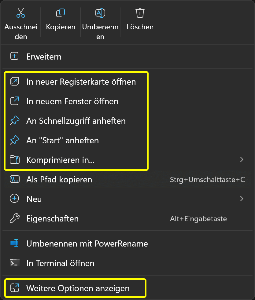 So können Sie in einem Explorer-Fenster mit mehreren Ordnern arbeiten, verteilt auf mehrere Registerkarten/Tabs. Neue Registerkarten öffnen Sie durch Klick auf + in der Registerzeile oder mittels Strg + T , wobei der Ordner jeweils in der neuen Registerkarte geöffnet wird. - In neuem Fenster öffnen ... - An Schnellzugriff anheften ... - Komprimieren in ... - In Bibliothek aufnehmen ... - Mit MS Defender überprüfen … ... ∘ Sortieren im Inhaltsbereich