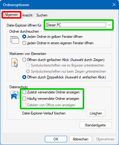 Die pink markierten Optionen (s.r.o.) werden in 9. Datenschutz abgehandelt. Unter W7 hieß Dieser PC noch Arbeitsplatz. Damals gab es die Verknüpfungslisten Biblitheken, die unter W10 aus Kompatibilitätsgründen noch bedienbar sind, aber eigentlich durch die Verknüpfungslisten Schnellzugriff abgelöst wurden. Daher kann man unter W10 zwischen der Darstellung Dieser PC und der Darstellung Schnellzugriff wählen. Das sind aber nur Einstiegspunkte zu den vier Gruppen Schnellzugriff, Onedrive, Dieser PC und Netzwerk im Navigationsbereich (s.r.). D.h. es werden immer alle vier Bereiche angezeigt, aufgeklappt oder nicht, aber immer durch rauf- und runtrscrollen erreichbar.