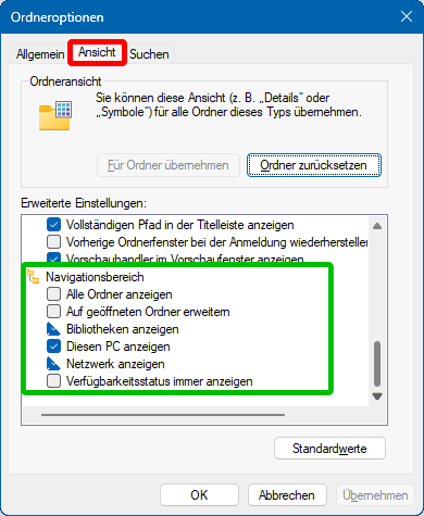Dann wechseln sie zur Karteikarte Ansicht (s.r.u.). Dort sollte am Ende der Erweiterten Einstellungen im Navigationsbereich möglichst nur ☐ Diesen PC anzeigen angehakt sein.