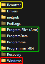 Die grün markierten Ordner sind die Standardordner für die Installation von Programmen (und deren Daten), gegliedert nach 32-Bit-, 64-Bit- und ARM-Programmen.