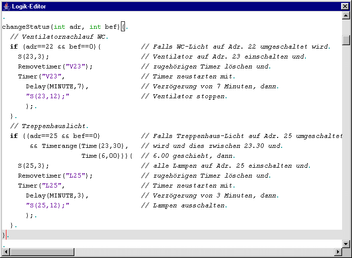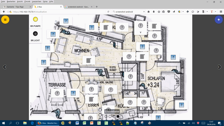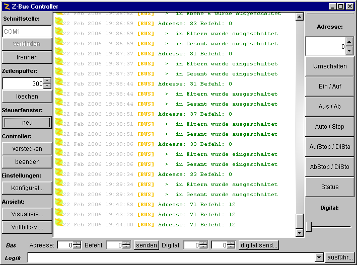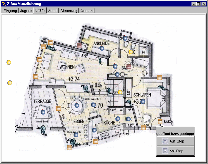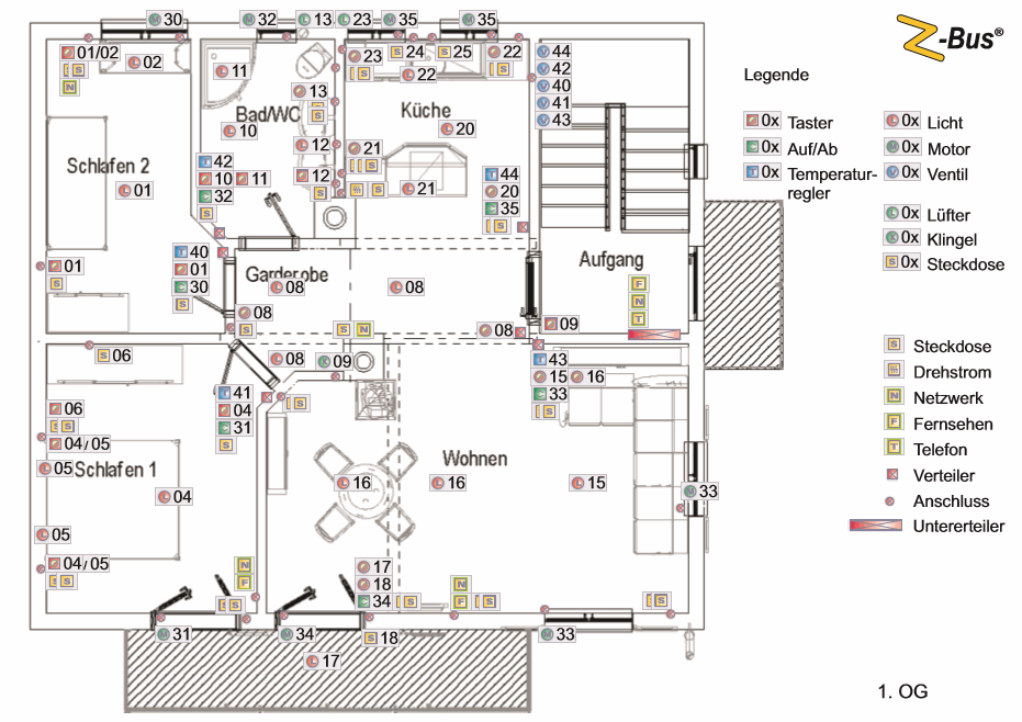 Realisiert haben wir neben der kompletten Beleuchtungssteuerung mittels klassischem Z-Bus nur die zeit- und anlassgesteuerte Rollladenbedienung (29 Rollläden auf 3 Wohnebenen), die Fußbodenheizungsregelung über Raumthermostate (10 Heizkreise auf 3 Ebenen), die Ventilatornachlaufsteuerung in den Bädern, die Nachtschaltung der Außenbeleuchtung und die Anwesenheitssimulation (getrennt in Nacht- und Urlaubsbetrieb) mittels programmgestütztem Z-Bus-Betrieb. Dabei haben wir knapp 80 Adressen vergeben.