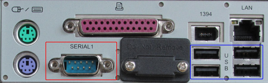 Wenn in modernen PCs keine COM-Schnittstelle mehr eingebaut ist (im Bild rot umrahmt), wird das Interface eben an einem USB-Anschluß (im Bild blau umrahmt) über einen USB-COM-Wandler angeschlossen (z.B. DIGITUS DA-70156 - USB 2.0 Typ-A zu Seriell Adapter).