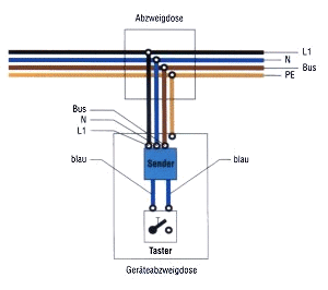 Wo ein derartiger vieradriger Netzstrang "vorbeikommt", kann ein Sensor (für Lichtschalter, Thermostat, usw.) oder ein Aktor (für Lampe, Rollladen, usw.) angeschlossen werden. Für die Sensoren benötigt man lediglich die tieferen Unterputzdosen (s.l.o.), damit hinter dem herkömmlichen Tastschalter auch der Sender/Sensor Platz findet. Und im Bild oben rechts ist auch für den Empfänger/Aktor eine (normale) Unterputzdose gezeigt; dies ist immer dann sinnvoll, wenn der Empfänger nicht im Lampengehäuse Platz findet.