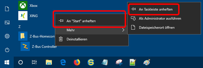 Falls keine Icons/Kacheln auf der Startseite oder in der Taskleiste erscheinen, können Sie das nachträglich im Startmenü über das Kontextmenü des Z-Bus-Controllers erledigen (s.r.). Dazu muss der Startmenü-Link bereits berichtigt sein (siehe b))!