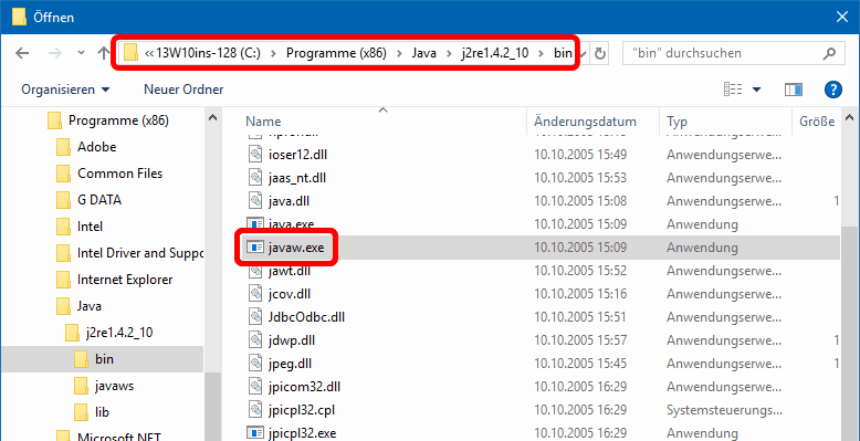 Brechen Sie jetzt ab, denn eine direkte Lösung wäre hier nur von kurzer Dauer. Aber auf dem Desktop ist ein Programmlink Z-Bus-Controller abgelegt (s.l.). Starten Sie diesen. Dann erhalten Sie denselben Hinweis auf javaw (s.o.). Klicken Sie auf Durchsuchen und gehen zu C:\Programme (x86)\Java\j2re1.4.2_10\bin\ (s.l.u.) und aktivieren dort javaw.exe.