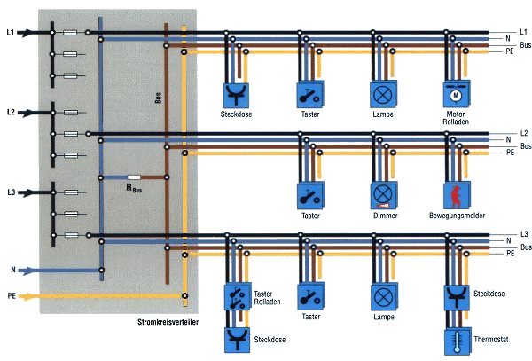 Nebenstehende Prinzip-Darstellung zeigt dies anhand eines mit den üblichen drei Phasen L1, L2 und L3 beschalteten Hauses beispielhaft im Zweig der unteren (dritten) Phase. Dort sind links ein Rollladentaster und eine Steckdose an einem "Strang" an­ge­schaltet. Trotzdem werden nur die vier Adern benötigt (und nicht min­destens sechs, wie bei herkömmlicher Verdrahtung). Auch die anderen in diesem L3-Zweig ange­schlos­senen Ele­mente (der Taster, die Lampe, die zweite Steckdose und der Thermostat) könnten am linken Strang mit seinen vier Adern angeschossen werden (her­kömmlich würden dafür mindes­tens neun Adern nötig).