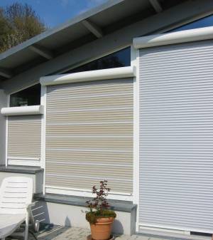 Daher war eine leistungsfähige Beschattungsanlage zu planen. Die Roll­läden (teils bis zu 3 m hoch) sollten elektisch bedienbar sein und die Steuerung sollte unaufdringlich gestaltet werden (also keine "Schalter­batterien"). Ferner war eine Steuerungslogik wünschenswert mit Gruppenschaltung (z.B. "Süd-Seite: alle Rollläden runter/rauf") und Zeitsteuerung (z.B. "18:00 Uhr: alle Rollläden rauf" oder "von 21:00 bis 24:00 Gartenbeleuchtung an"). Dabei war für Urlaub usw. eine Anwesenheitssimulation geplant.